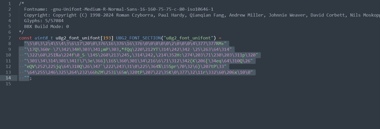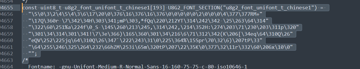 完成转码后,字库代码会在u8g2_font_unifont.c中,打开后把内容复制一下。
